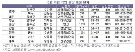 12월에 전국적으로 총 85개 단지에서 3만6597가구가 공급된다. 이중 일반분양(임대제외)은 2만6985가구, 임대아파트는 4869가구 등이다.