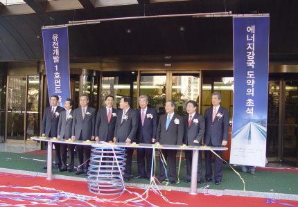 사진 오른쪽부터 굿모닝신한증권 이동걸 사장, 한국투자증권 홍성일 사장, 기업은행 강권석 행장, 대우인터내셔널 이태용 사장, 산업자원부 이원걸 차관, LS 니꼬 구자명 부회장, 한국석유공사 서문규 부사장, 대신증권 노정남 사장, 삼성증권 김석 부사장 .