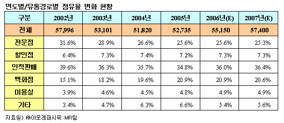 ■유통경로= 과거에는 특정 유통 경로가 전체 화장품산업의 성장을 이끌어 왔지만, 표2에 나타난 것과 같이 최근에는 유통경로가 매우