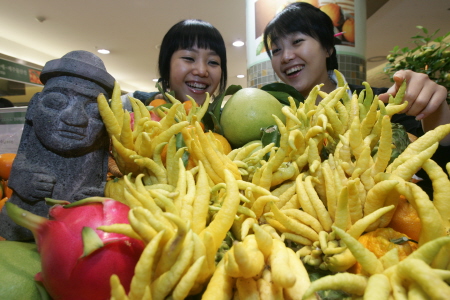 [프라임경제]현대백화점 무역센터점은 30일(목) 제주産 희귀 관상용 과일인 불수감을 판매한다. 열매의 끝이 손가락처럼 갈라진 것이 부처님의 손같이 생겼다고 생각하여 붙여진 이름이다. 불수감은 익은 후, 빛깔과 광택이 금황색을 띠고, 반지르르하다. 향기가 짙고 은은해 기분을 상쾌하게 만들어준다. 가격은 100g 2,300원.
