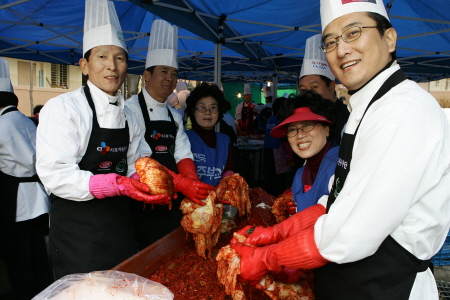 [프라임경제]정진구 대표( 사진 왼쪽 끝)를 비롯한 CJ푸드빌임직원50여명은 1일 일원제2노인정에서 김장 2,000포기 직접 담궈 강남구 노인복지관 200여곳에 전달했다.