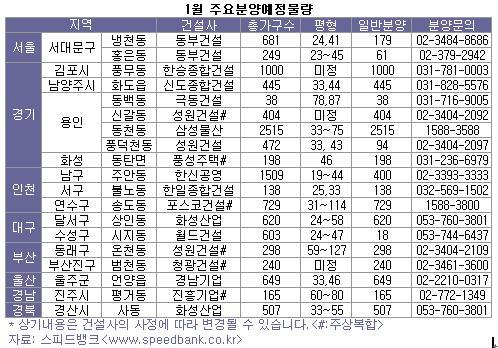 스피드뱅크(www.speedbank.co.kr)가 조사한 바에 따르면, 내년 1월, 전국 20개 단지 총 1만1510가구가 공급되는 것으로 나타났다. 이중 일반분양은 8748가구.