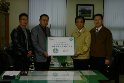 <사진 =데톨의 서재현 이사와 임량희 관리팀장이 민봉한 익산 부시장과 유택수 익산 보건소장에게 조류 인플루엔자 바이러스(H1N1) 예방에 효과적인 데톨 항균 스프레이를 전달하고 있다.