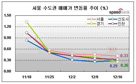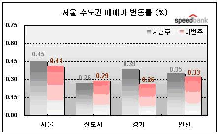스피드뱅크(www.speedbank.co.kr)가 서울 등 수도권아파트 주간 매매가격 변동률을 조사한 결과, 서울 0.41%·신도시 0.29%·경기 0.26%·인천 0.33%를 기록했다. 11.15대책 이후 지속적으로 상승폭이 둔화되는 가운데 신도시는 20평대 이하 소형아파트의 강세로 전 주에 비해 오름폭이 다소 커진 모습이다.