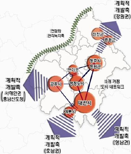 공간구조는 행정도시·연기~공주~대전·계룡~청주·청원~진천·증평의 5대 거점도시 네트워크로 구성하고 있으며, 국가균형발전을 촉진하기 위해 행정도시로부터 국토의 전 방향으로 4개의 계획적 개발축을 설정하고, 수도권과 연담화 방지를 위한 녹지축을 구성하고 있다.