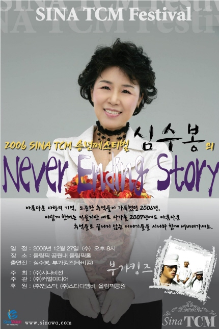 ㈜시나비전이 주최하고 ㈜스타디엠비에서 후원하는 이번 ‘Never Ending Story’ 페스티벌에서, 그녀는 2006년을 마무리하며, 아름다운 사랑의 기억과 소중한 감성을 자극하는 환상적인 무대를 선보일 예정이다.