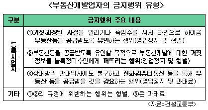 부동산개발업자(위탁·대행 포함)가 부동산개발에 관한 허위정보를 퍼뜨리거나 상대방의 의사와 상관없이 전화·컴퓨터(인터넷) 통신 등을 통해 부동산 매수를 강요하는 행위가 금지된다.