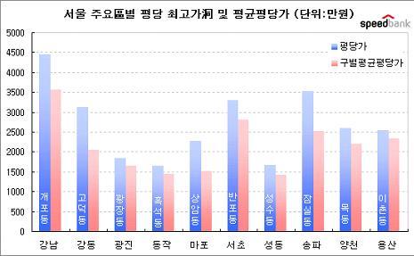 서울 25개구의 동별 평당 매매가격을 20일 스피드뱅크(www.speedbank.co.kr)가 조사한 결과, 평당 매매가격이 가장 높은 곳은 강남구 개포동으로 평당 4454만원인 것으 나타났다.