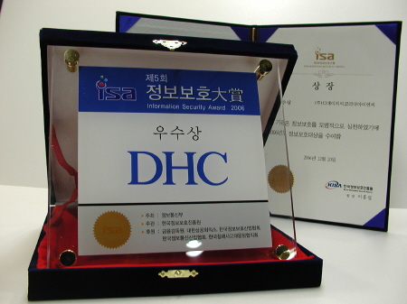 [ 프라임경제DHC코리아 (www.dhckorea.com)는 2006년 20일(수), 정보통신부가 주최하고 한국정보보호진흥원(KISA)이 주관하는 '제5회 정보보호대상' 시상식에서 우수상을 수상했다.