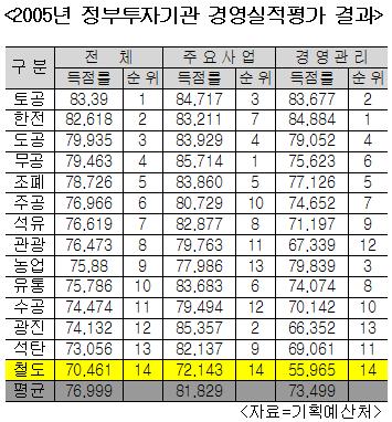 경영평가는 기관평가와 사장평가로 나뉘는데, 이 같은 내용이 사장평가에도 같은 내용으로 기록되어 있다. 이러한 부진한 성적으로 지난해 철도공사는 14개 정부투자기관 경영평가에서 최하위인 14위를 기록했다.(표 참고)