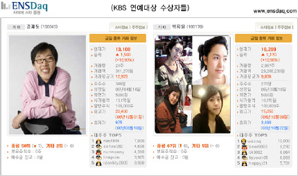 스타의 인기도가 주가로 나타나는 사이버 스타증권 엔스닥(www.ensdaq.com)에서는 KBS연예대상 이전부터 연말 수상에 대한 기대로 상승세를 보이는 김제동과 박지윤株는 시상식 발표가 있었던 12월 23일부터 배당에 대한 기대로 상한가를 달리고 있다.