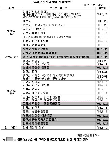 건교부 관계자는 “올해부터 실거래가 신고제도가 시행되는 점을 감안해 지난 2005년 9월 이후 주택거래신고지역을 추가로 지정하지 않았으나, 지난 11월7일부터 주택거래신고지역 안에서 6억원을 초과하는 주택 거래시 자금조달 계획서 제출이 의무화됨에 따라 이번에 지정요건에 해당하는 지역 중 일부를 새로 지정하게 되었다”고 밝혔다.