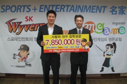 지난 27일(수) 엠게임은 프로야구 후반기 시즌에 이진영 선수의 활약으로 모인 적립금 약 8백만 원을 ‘사랑의 야구 장학 성금’으로 쾌척하고, 엠게임 본사에서 이진영 선수에게 성금 전달식을 가졌다.
