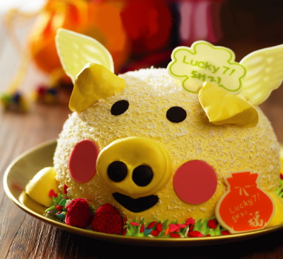 ‘황금복福돼지 케이크’는 재물복을 상징하는 황금 돼지 모양 아이스크림 케이크에, 초콜릿으로 만든 복 주머니와 날개 등으로 장식하였다.