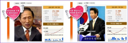 한편 고건 총리 인사파문, 작통권 발언, 언론불신, 박정희 대통령 비판발언 등으로 논란을 야기 했던 노무현 대통령 株는 그 동안 지지율 하락과 함께 주가가 급락하여 약세를 면치 못했었지만 임기 말까지 홀로서기를 고수 하겠다는 적극적인 대응에 지지기반 결집에 성공적인 효과를 거두면서 오히려 주가는 연말 1,185원 에서 2,350원대까지 급등하고 있다.
