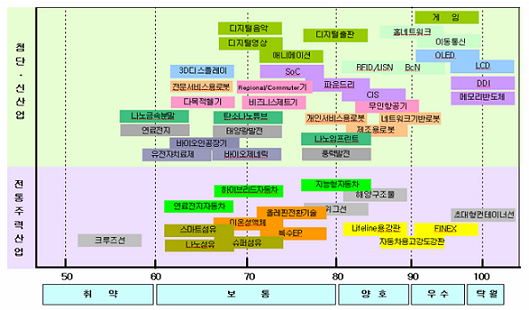 이에 대해 산은 기술평가원 박재룡 팀장은 “세계 최고로 손꼽히고 있는 분야는 지금 그대로 유지하고 보통 등의 단계에 선정된 분야는