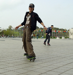 ‘엑슬라이더’란 양쪽 발이 서로 다르게 움직이는 인라인 스케이트의 장점과 발을 고정하지 않고 플레이트에 올라서서 타는 스트리트 보드의 장점을 지니고 있는 퓨전 스타일의 스트리트 보드.