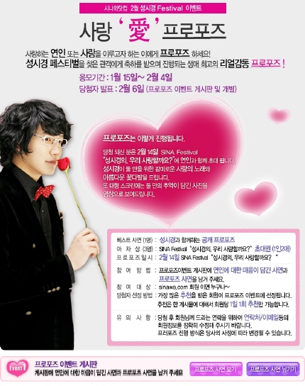 [프라임경제]문화콘텐츠사이트 시나와닷컴(www.sinawa.com)은 2월 14일 성시경과 함께하는 ‘2007 시나 페스티벌’을 앞두고 깜짝 고백과 멋진 프러포즈를 할 수 있는 “사랑 愛 프러포즈” 이벤트를 실시한다.