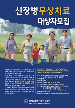 한국정화의학연구재단은 홈페이지를 통해 2007년 2월 한달 동안 전국적으로 신장병환자를 모집한다. 무상치료 대상자는 현재 투석 중이거나 투석단계가 아닌 신장질환 보유자와 고혈압, 당뇨병으로 3년 이상 약물 복용자이다. 치료기간은 2007년 3월부터 2008년 2월까지이다.(문의:051)335-5618, www.clean-technology.co.kr)