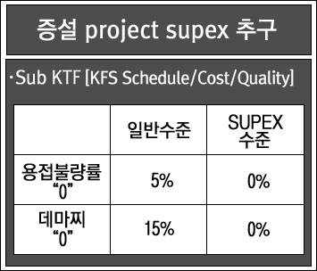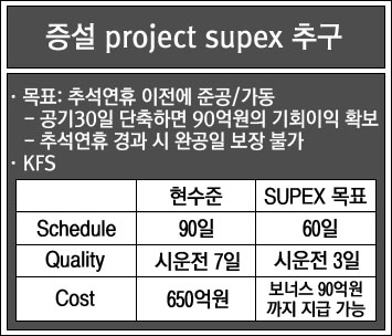한마디 덧붙인다면 목표하였던 공기 단축은 SUPEX 목표 일수인 60일을 훨씬 하회하는 49일에 완공되어 초과 달성되었다. 조기 완공에 대한 보너스를 SK건설에 지불하려고 하자 SK건설 사장은 손을 내저었다. 비록 단가 높은 용접사를 투입하는 등 부분적으로 비용 증가 요인이 없었던 것은 아니나, 공기단축으로 인해 이미 충분한 공사비 절감이 이루어져서 보너스까지 받을 염치가 없다는 것이 그 이유였다. 그뿐 아니라 이 공동 SUPEX 추구를 통하여 많은 것을 배웠으며 그것으로 이미 충분히 보상을 받았다는 것이었다.