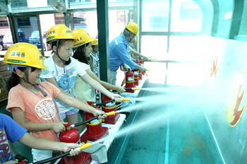 | 대우조선해양 안전체험관을 찾은 아이들이 소화기 다루는 법에 대해 실습을 하고 있다. | ||
