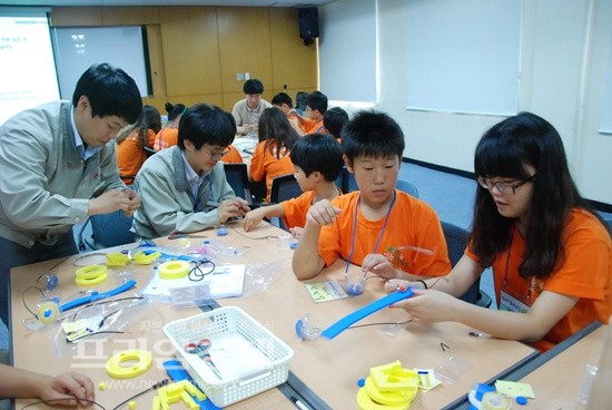 | 엘지화학 여수공장 직원들이 최근 임직원 자녀들에게 화학캠프 시간을 갖고 있다. 사진은 LG화학 제공. | ||