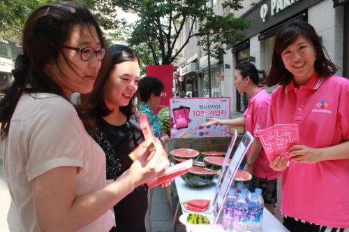 [프라임경제] 10만명 가입자를 돌파한 CJ헬로비전이 7일 오전 목동 CBS 건물 앞 광장에서 시민을 대상으로 수박 100통을 돌리며 소식을 알렸다.
