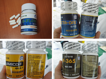 | 발기부전치료제를 함유해 유통·판매된 '가짜 건강기능식품'들. 좌측 상단부터 시계방향으로 '지-플로우', '옥타원', '라미코-F', 'F-365'. | ||