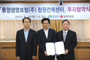 | 창원시청에서 열린 투자양해각서 체결식에는 동양생명 구한서 사장(오른쪽), 조기호 창원제1부시장, 동양생명 김윤성 영업총괄본부장 등이 참석했다. | ||