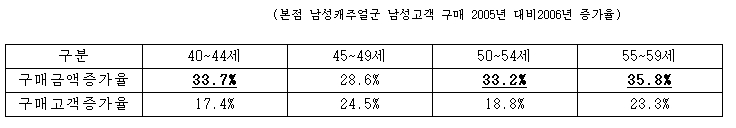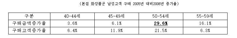 롯데백화점 본점의 40세부터 59세까지 남성구매고객의 화장품 구매의 경우 2005년 대비 2006년, 구매금액은 10.9%, 구매고객수는 11.3% 증가하였다.