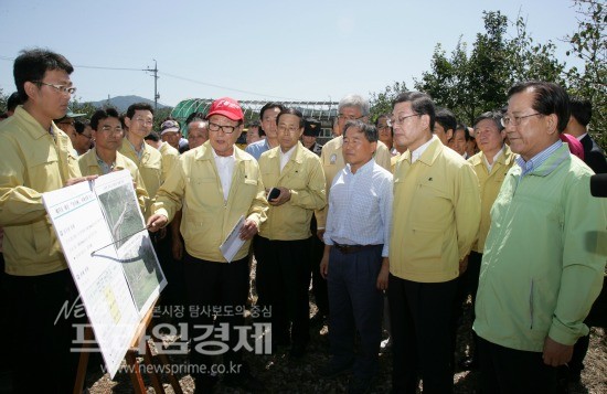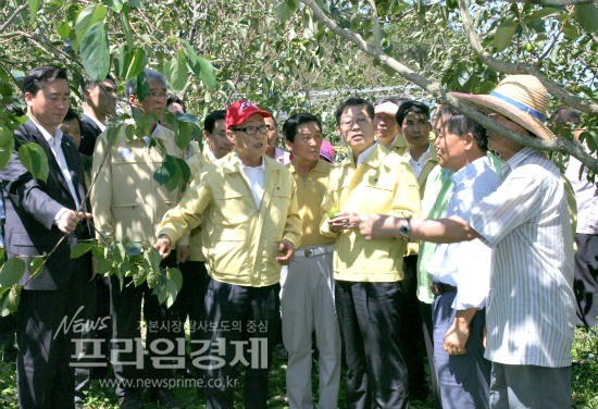 [프라임경제] 김황식 국무총리가 31일 오후 전남 영암군 금정면을 방문, 이번 태풍으로 큰 피해를 입은 대봉감 농가를 위로하는 등 피해 현장 점검에 나섰다. 이 날 피해 현장에는 김 총리를 비롯한 박준영 전남지사와 김일태 영암군수, 피해 농민들이 함께했다.
