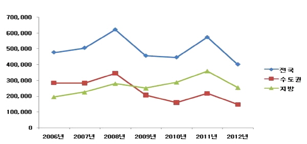 연도별 같은기간 거래량을 살펴보면 △2006년 47만7378건 △2007년 50만5832건 △2008년 62만2660건 △2009년 45만5697건 △2010년 44만5724건 △2011년 57만3999건 △2012년 40만799건이다.