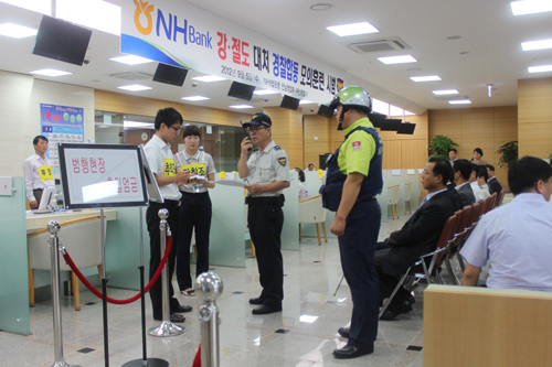 [프라임경제] NH농협은행 전남영업본부(본부장 박종수)는 5일 최근 금융점포를 표적으로한 강·절도 사고가 증가함에 따라 금융안전사고 예방에 대한 경각심을 고취시키고 무장 강도사고 발생시 대처 능력을 배양하기 위해 전남영업부에서 유관기관 합동 모의훈련을 가졌다.