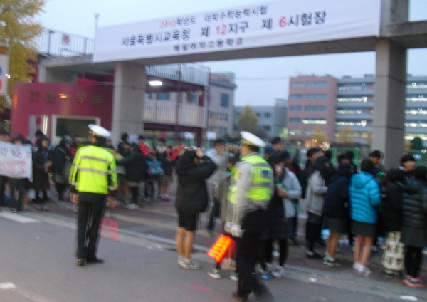 아, 저 사진 속 뒷모습의 주인공은 아마도 선배 수험생들을 응원하러 나온 학생일텐데요. 아마 그냥 머리를 매만지고 있었던 것이겠지요? 사실 수능날엔 수험생이 경황없는 거지 응원단이 멘붕(경악해 정신이 하나도 없음을 말하는 속어)올 일은 별로 없으니까요. 어쨌든 나중에 시간이 흘러 스스로 수험생으로 수험장에 나타나는 그 해 그날엔 저런 멘붕 포즈 취할 일 전혀 없이 침착하게 시험 잘 치르기를 '예약전송'으로 기원해 드리겠습니다. 아울러 사진에 등장해 준 수험생·응원나온 후배·학부형 그리고 질서유지 경찰관 모두 고생하셨습니다. 고맙습니다.