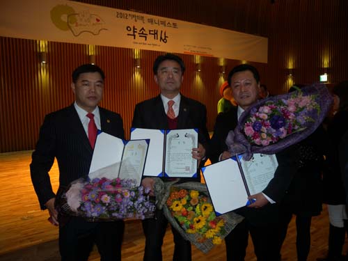 [프라임경제] 광주시의회 송경종, 손재홍, 조영표 의원이 한국매니페스토실천본부에서 주관한 ‘2012 지방의원 매니페스토 약속대상 최우수상’을 수상했다. 시상식은 8일 오후 2시 서울특별시청 다목적홀에서 열렸다.