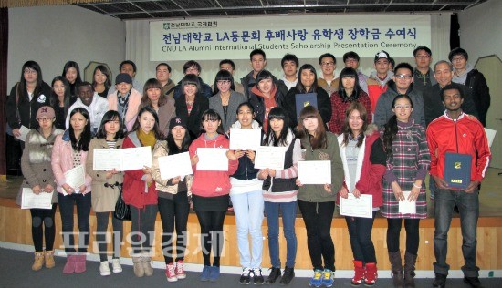 전남대 국제협력본부(본부장 신경구)는 지난 22일 박물관 시청각실에서 유학생 60명에게 LA동문회(회장 정찬열) 후배사랑 장학금 6,000달러를 전달했다.