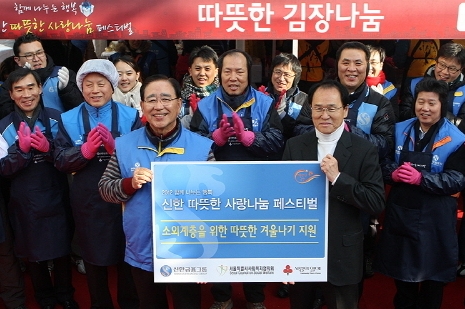 | 한동우 신한금융그룹 회장(첫째줄 왼쪽에서 세번째)이 따뜻한 겨울나기 지원에 임직원들과 동참하고 있다. | ||