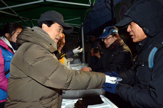 | 강운태 광주광역시장이 1일 오전 7시 증심사 지구 일원에서 열린 무등산 국립공원 승격 시민한마당 축하 행사에서 시민들에게 주먹밥을 나눠주며 새해 덕담을 나누고 있다. | ||