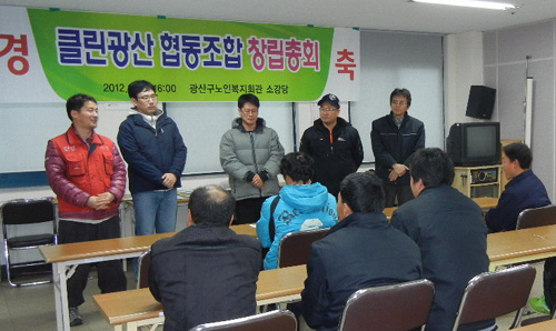 ‘클린광산협동조합’(이사장 신영훈)은 기존에 청소를 대행하던 D미화 소속 미화원 16명이 구랍 12월 21일 설립했다. D미화는 업체의 사정으로 2013년 청소 대행계약 해지가 예정됐다. 미화원들은 대행계약 해지를 앞두고 2012년 9월부터 고용승계를 요구하며 집회 등 단체행동에 돌입한 바 있다.