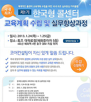 | 코어컨설팅은 오는 24일부터 이틀간 국내 콜센터에 맞춘 '한국형 콜센터 교육과정'을 실시해 2013년 콜센터 시장을 분석할 예정이다. | ||