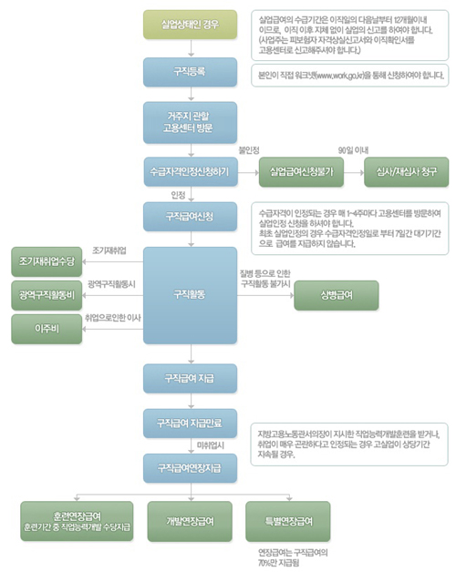 | 실업급여는 크게 구직급여와 취업촉진수당으로 나눠져 있으며, 사진은 실업급여 지급 절차다. | ||