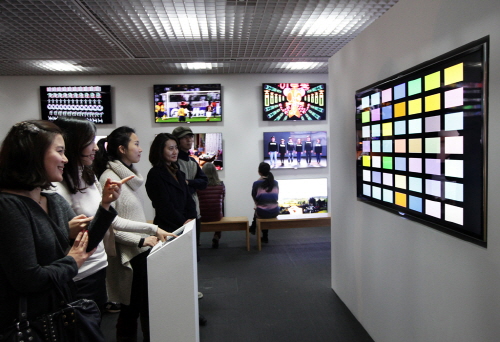 | 오는 28일까지 아트센터 나비에서 열리는 '디지털 퍼니처' 전시회를 찾은 관람객들이 삼성 스마트TV를 통해 전시되는 작품들을 감상하고 있다. | ||