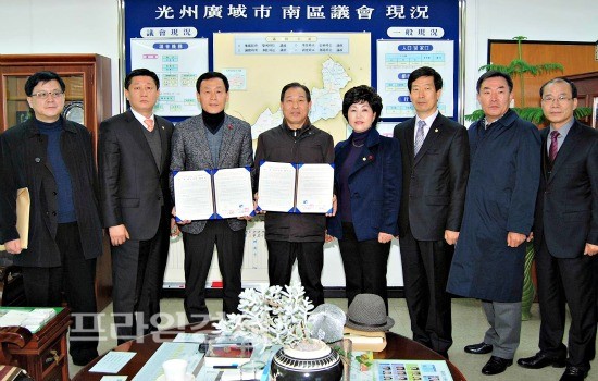 | 오수열 조선대 정책대학원장과 박춘수 남구의회 의장 등 남구의원들은 지난 4일 남구의회에서 석사학위과정 운영을 위한 협약을 체결했다. | ||