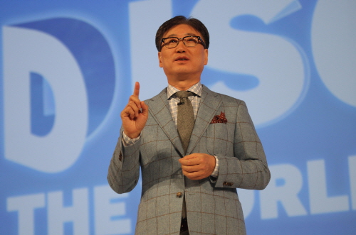 | CES 2013 개막에 앞서 열린 삼성전자 프레스 컨퍼런스에서 삼성전자 CE부문 윤부근 사장이 '소비자에게 무한한 가능성을 제공한다'는 주제로 발표하고 있다. | ||