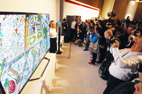 [프라임경제] LG전자(066570)가 현지시각 7일 미국 라스베이거스 만달레이베이 호텔에서 열린 'LG전자 프레스 컨퍼런스'에서 올해의 전략제품과 스마트 기술을 소개했다. 1000여명의 국내외기자들이 84형 울트라HD TV를 관람하고 있다.
