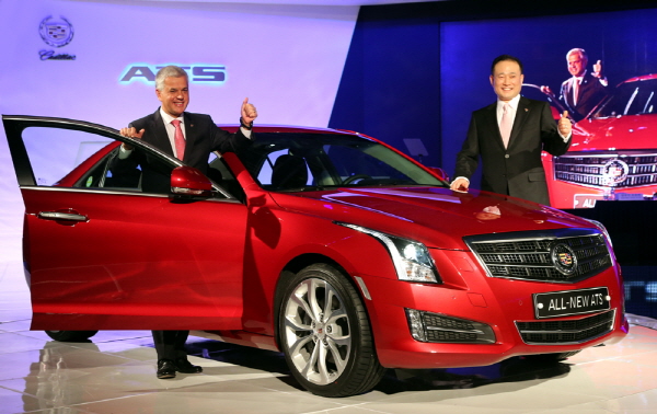 | 캐딜락 ATS의 출시행사장에서 세르지오 호샤 사장과 장재준 사장이 포즈를 취하고 있다. | ||