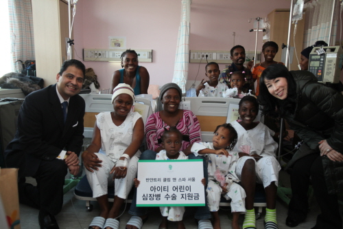 | 반얀트리 호텔 총지배인 알버트 오카시오(Albert Ocasio, 사진 맨 좌측)와 소프라노 신영옥씨(사진 맨 우측)가 지난 7일 고려대 안산병원에 방문, 심장병 치료 어린이들을 직접 만났다. | ||