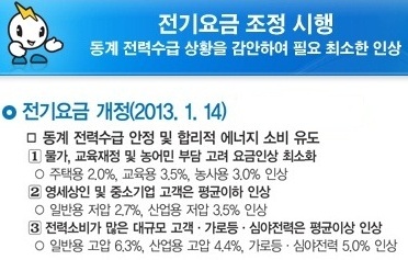 9일 지식경제부는 한전의 '전기공급약관 변경안'을 인가했다. 이에 따라 오는 14일부터 용도별로 △주택 2% △산업 4.4% △일반 4.6% △농사 3% △심야 5% 등 평균 4% 정도 전기요금이 인상된다.