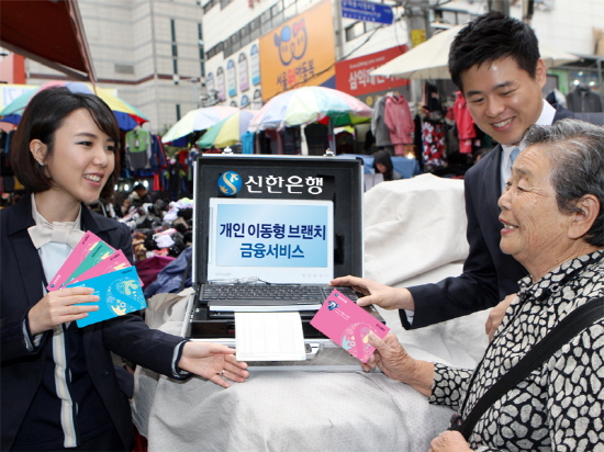 지난해 10월부터 '개인 이동 브랜치 금융서비스'를 실시하는 신한은행은 휴대용 금융 단말기 'S-KIT'를 통해 영업점과 동일한 시스템 환경을 제공한다. 또한 지난해 12월 말에는 '소형버스 이동점포' 서비스를 금융 소외지역 중심으로 시행해 고객을 직접 찾아다니며 금융서비스를 제공했다.