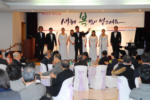 | 일청합창단원들이 범 사회복지계의 성장과 발전을 기원하는 의미에서 축가 '내 맘의 강물, 오 해피데이)를 열창하고 있다. 일청합창단은 주식회사 원풍실업 정진원 이사장이 1993년 창단한 합창단으로 소외계층을 대상으로 많은 재능기부를 펼치고 있다. | ||